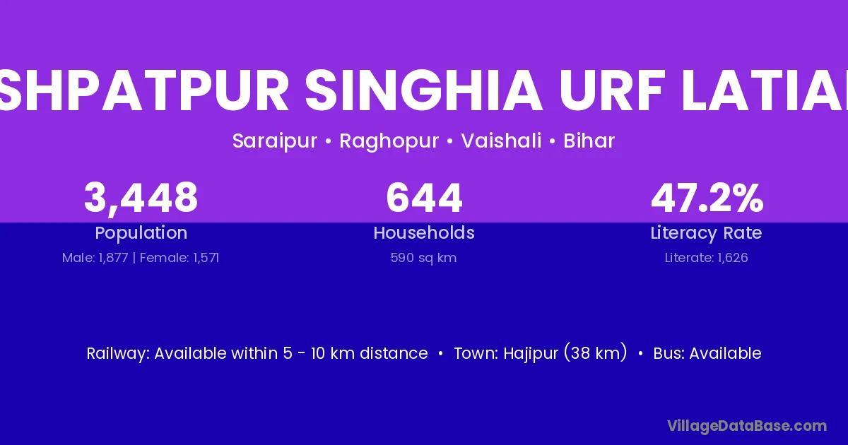 Hajipur (38 km) is the nearest town to Ashpatpur Singhia Urf Latiahi village for major economic activities and is located approximately 38 km away.