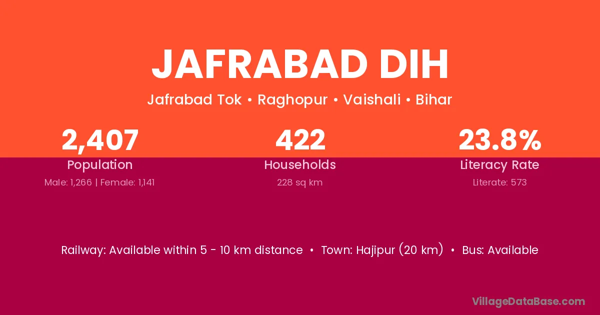Hajipur (20 km) is the nearest town to Jafrabad Dih village for major economic activities and is located approximately 20 km away.
