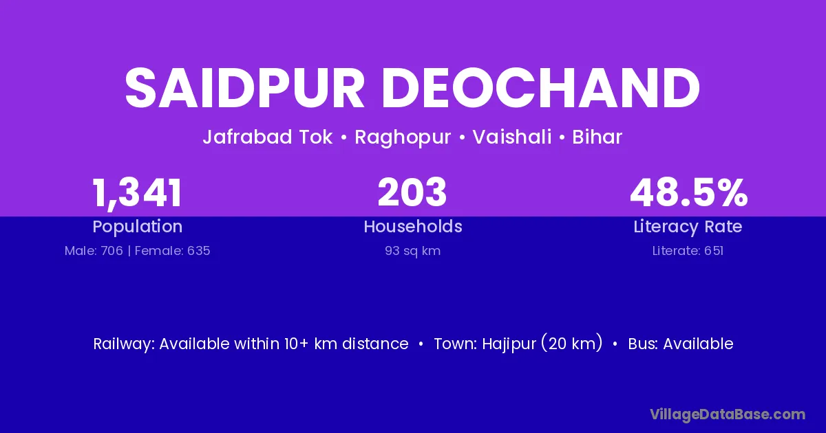 Saidpur Deochand village has a total population of 1,341 people, of which 706 are males and 635 are females.