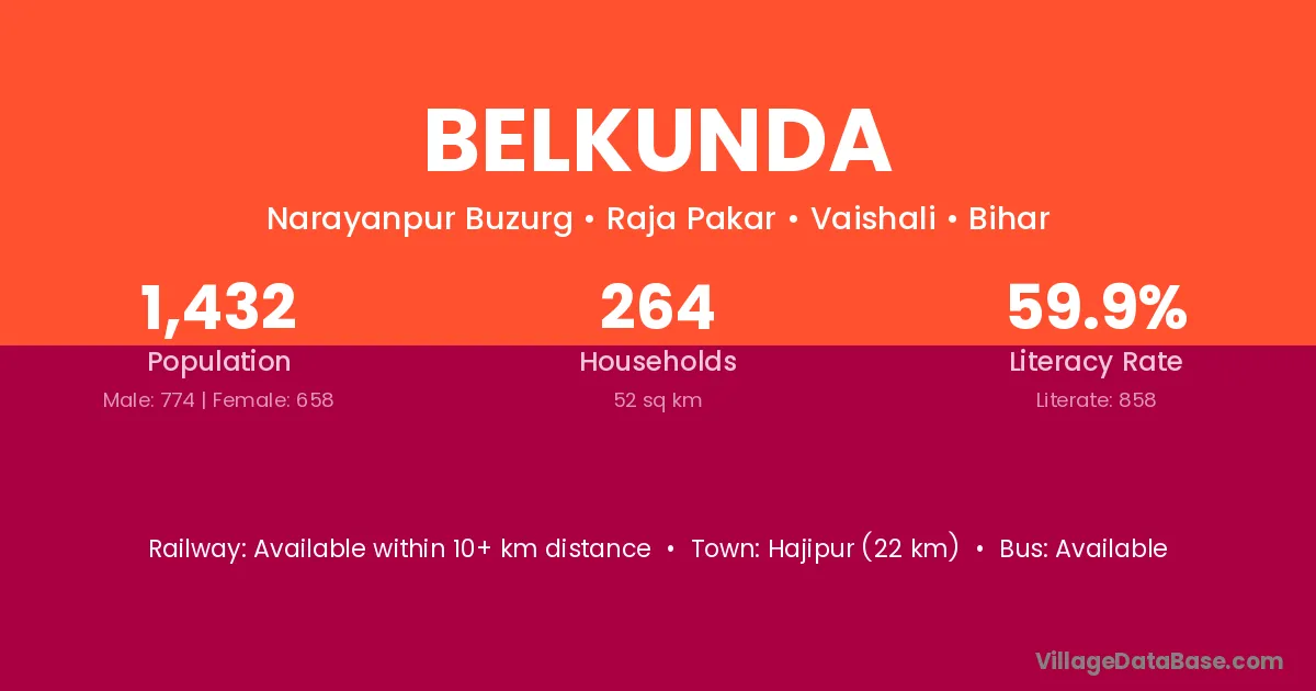 Hajipur (22 km) is the nearest town to Belkunda village for major economic activities and is located approximately 22 km away.
