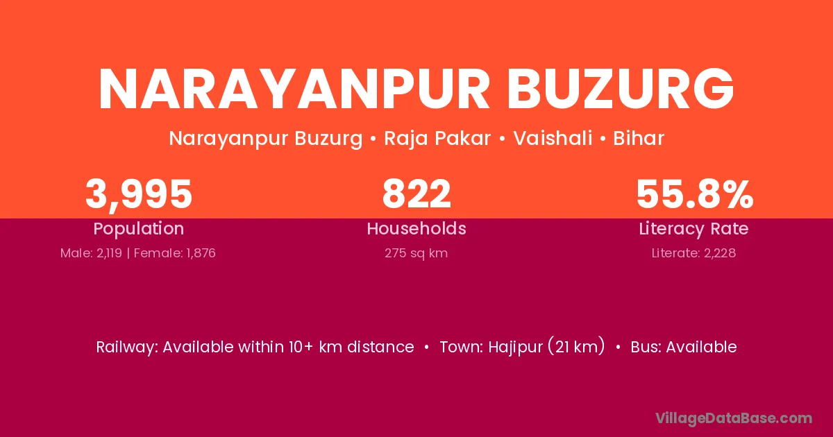 Hajipur (21 km) is the nearest town to Narayanpur Buzurg village for major economic activities and is located approximately 21 km away.