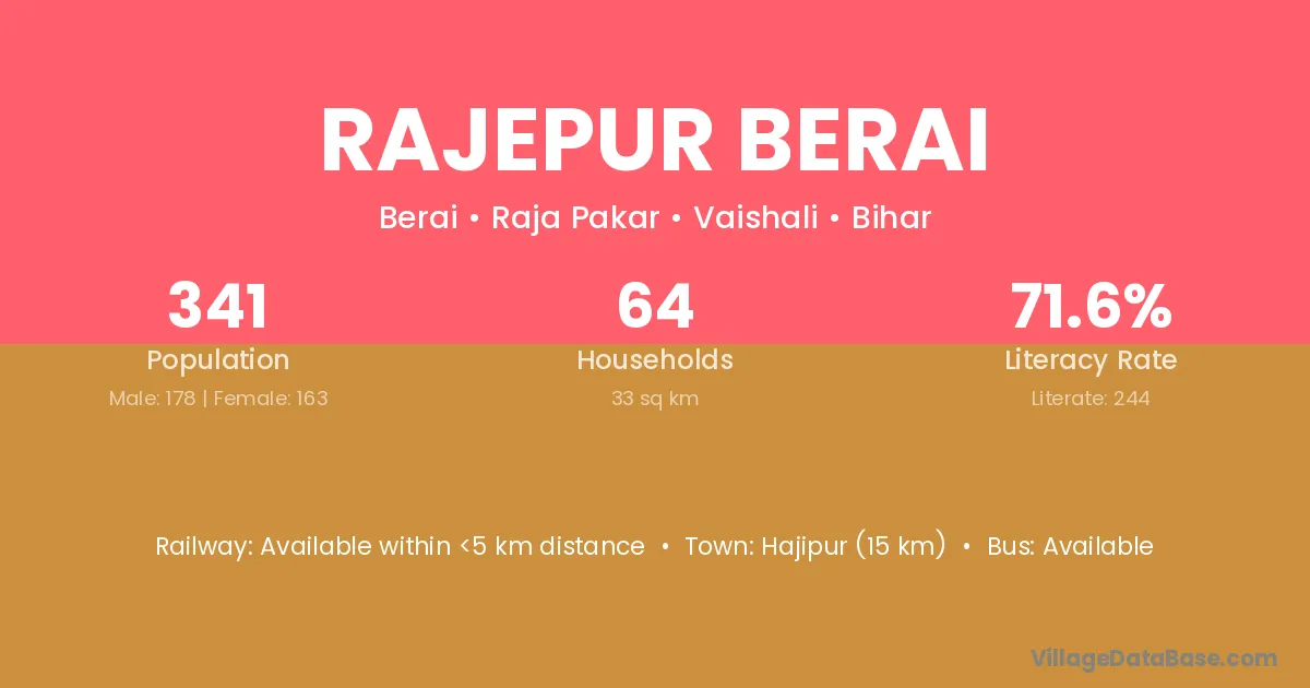 Hajipur (15 km) is the nearest town to Rajepur Berai village for major economic activities and is located approximately 15 km away.