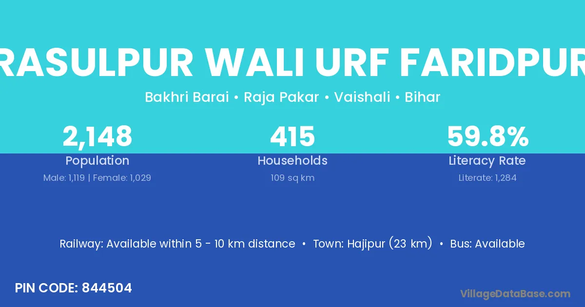 Hajipur (23 km) is the nearest town to Rasulpur Wali Urf Faridpur village for major economic activities and is located approximately 23 km away.