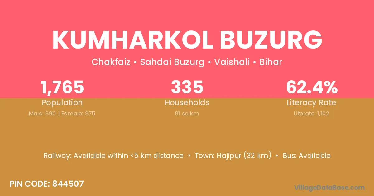 Hajipur (32 km) is the nearest town to Kumharkol Buzurg village for major economic activities and is located approximately 32 km away.