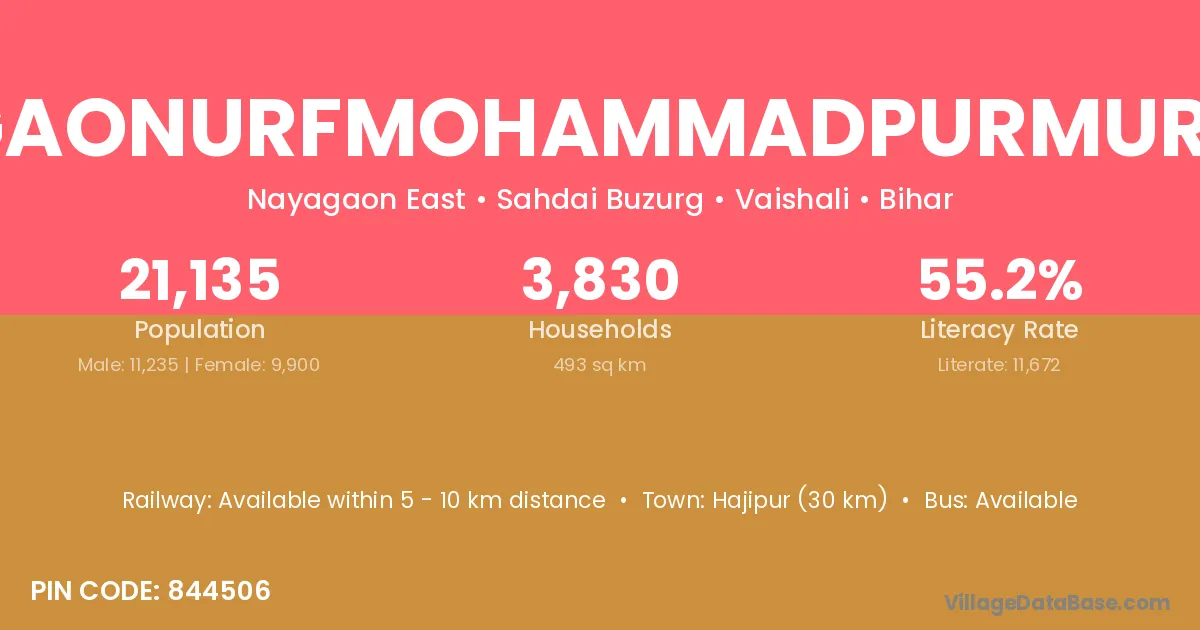 Nayagaonurfmohammadpurmuradpur village has a total population of 21,135 people, of which 11,235 are males and 9,900 are females.