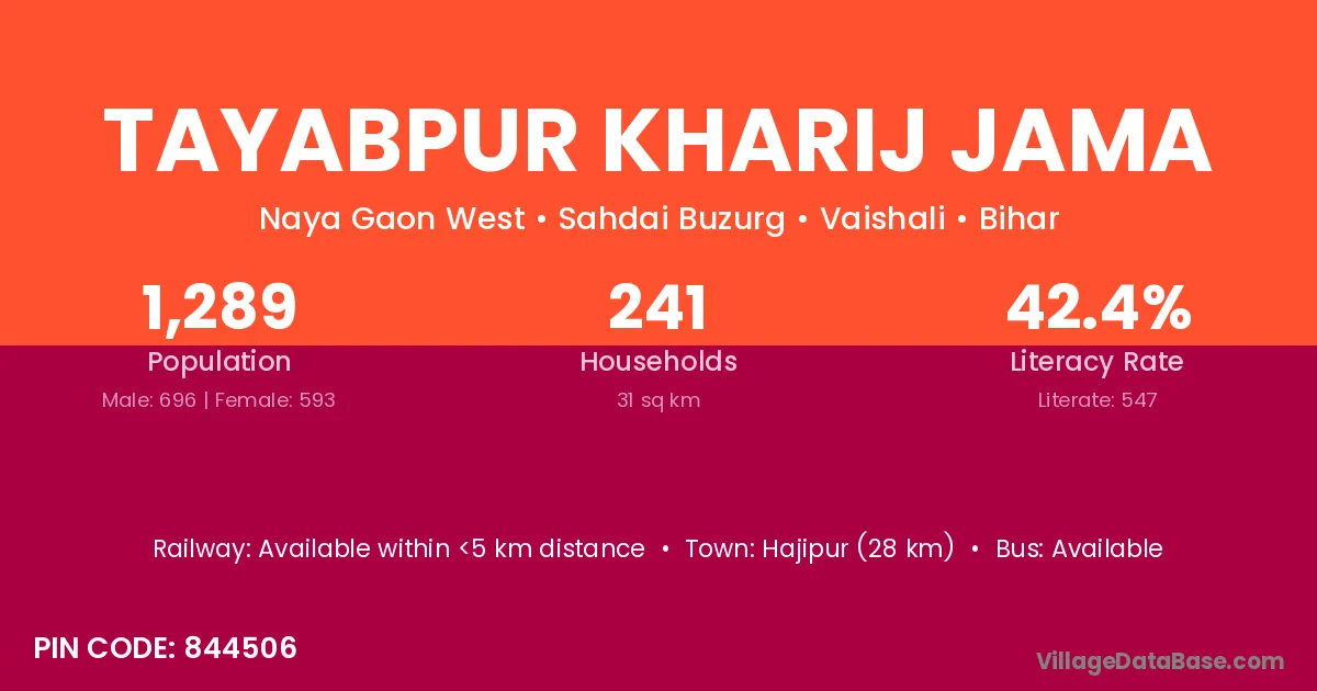 Hajipur (28 km) is the nearest town to Tayabpur Kharij Jama village for major economic activities and is located approximately 28 km away.