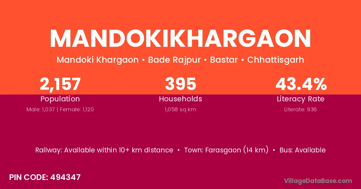 Mandokikhargaon village has a total population of 2,157 people, of which 1,037 are males and 1,120 are females.