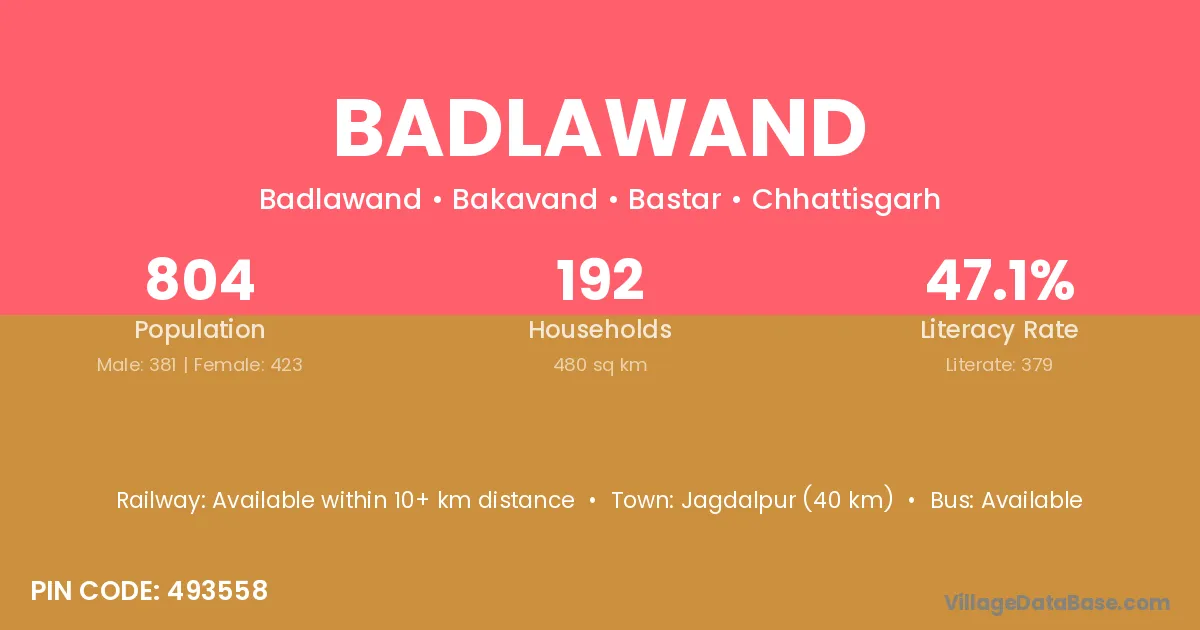Jagdalpur (40 km) is the nearest town to Badlawand village for major economic activities and is located approximately 40 km away.