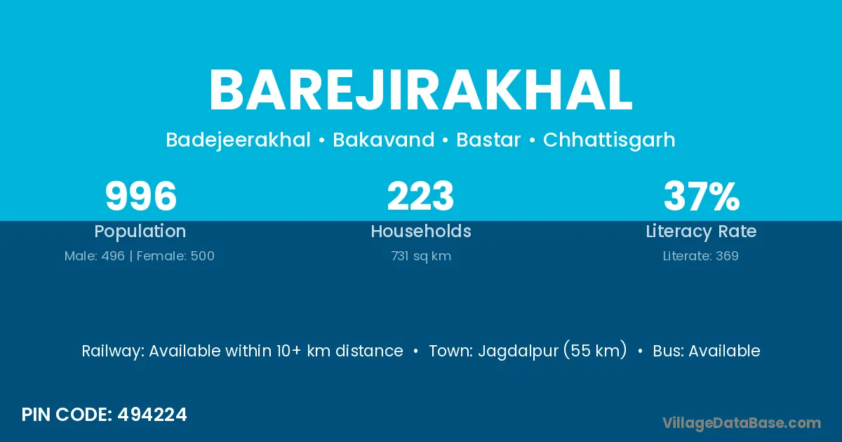 Jagdalpur (55 km) is the nearest town to Barejirakhal village for major economic activities and is located approximately 55 km away.