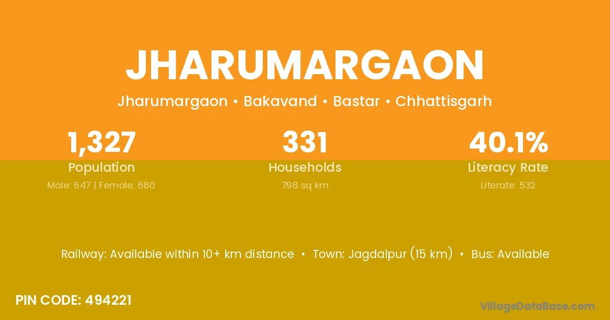 Jagdalpur (15 km) is the nearest town to Jharumargaon village for major economic activities and is located approximately 15 km away.