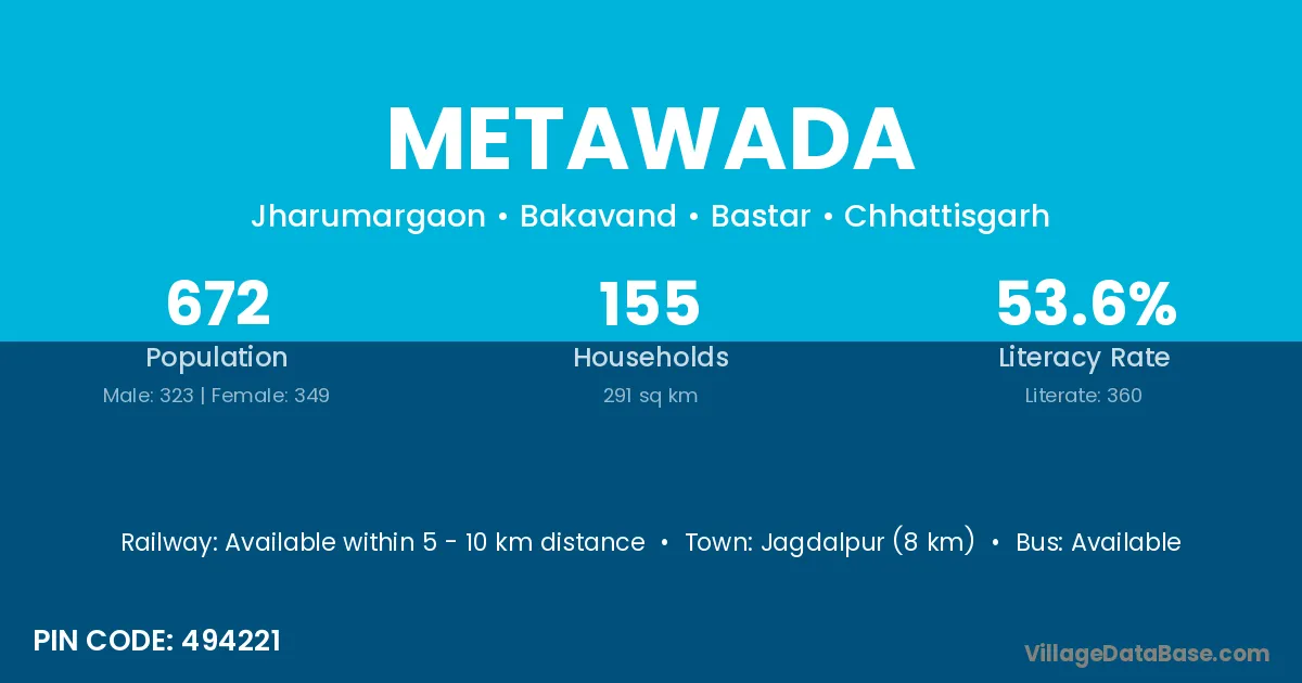 Jagdalpur (8 km) is the nearest town to Metawada village for major economic activities and is located approximately 8 km away.