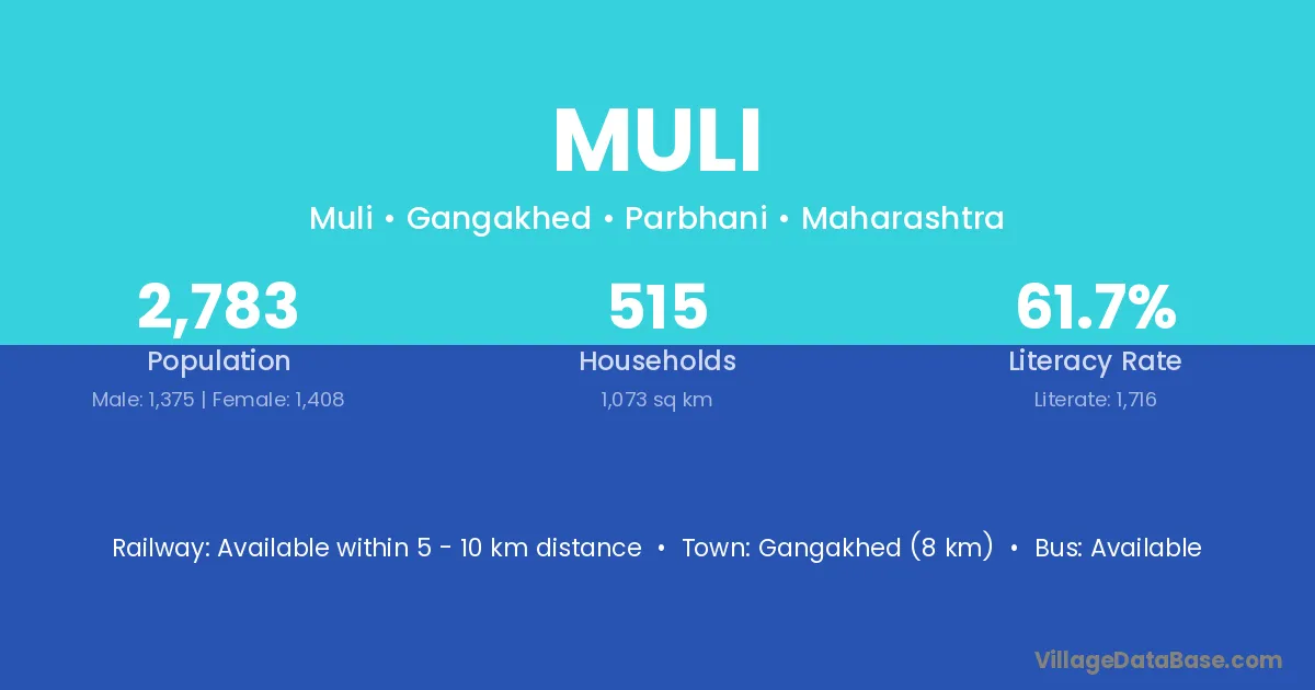 The literacy rate of Muli village is 46.04%. Male literacy stands at 53.65% and female literacy at 38.33%.