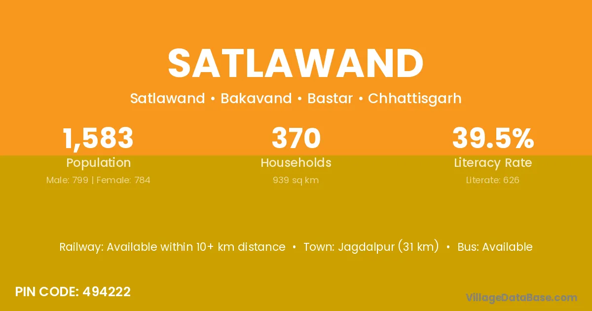 Jagdalpur (31 km) is the nearest town to Satlawand village for major economic activities and is located approximately 31 km away.