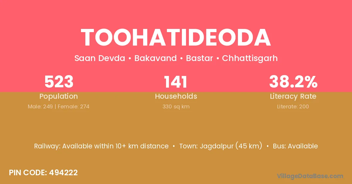 Jagdalpur (45 km) is the nearest town to Toohatideoda village for major economic activities and is located approximately 45 km away.