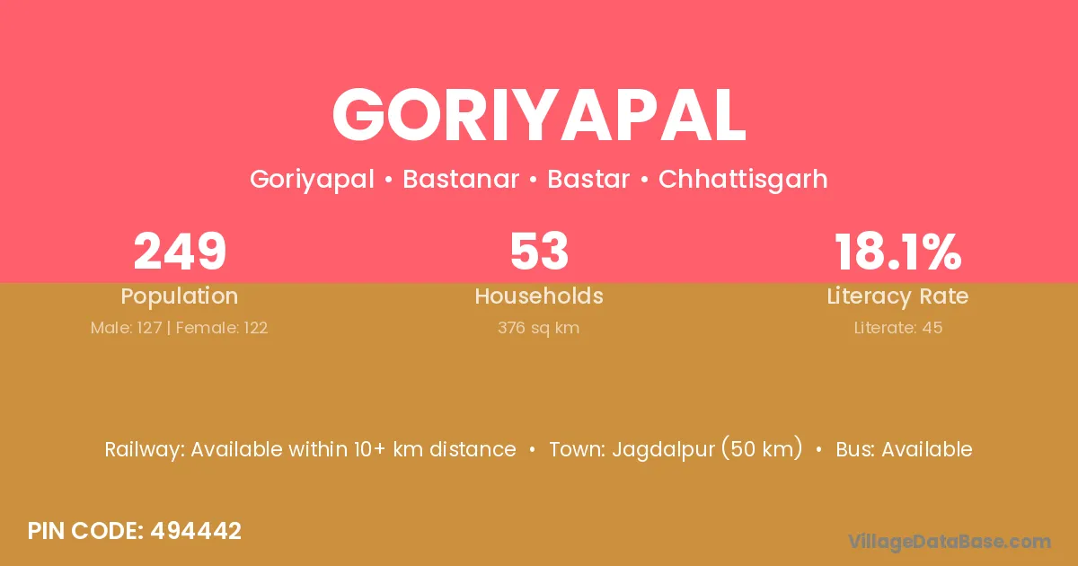Jagdalpur (50 km) is the nearest town to Goriyapal village for major economic activities and is located approximately 50 km away.
