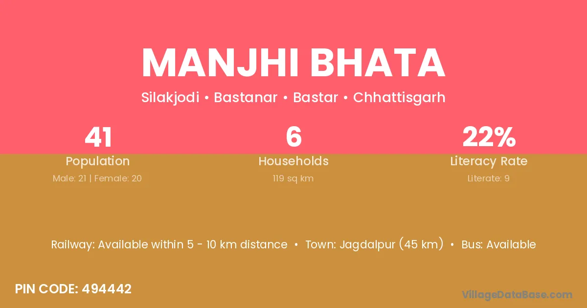 Jagdalpur (45 km) is the nearest town to Manjhi Bhata village for major economic activities and is located approximately 45 km away.