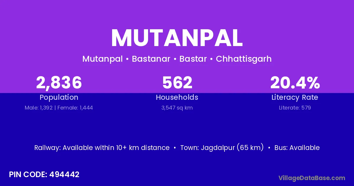 Jagdalpur (65 km) is the nearest town to Mutanpal village for major economic activities and is located approximately 65 km away.