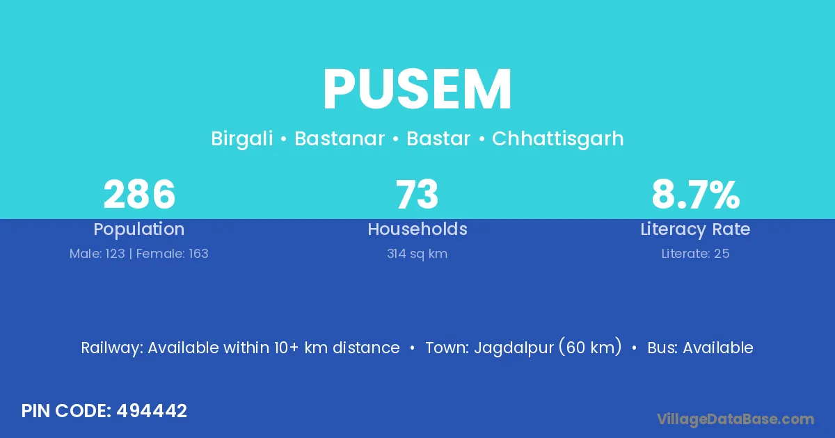 Jagdalpur (60 km) is the nearest town to Pusem village for major economic activities and is located approximately 60 km away.
