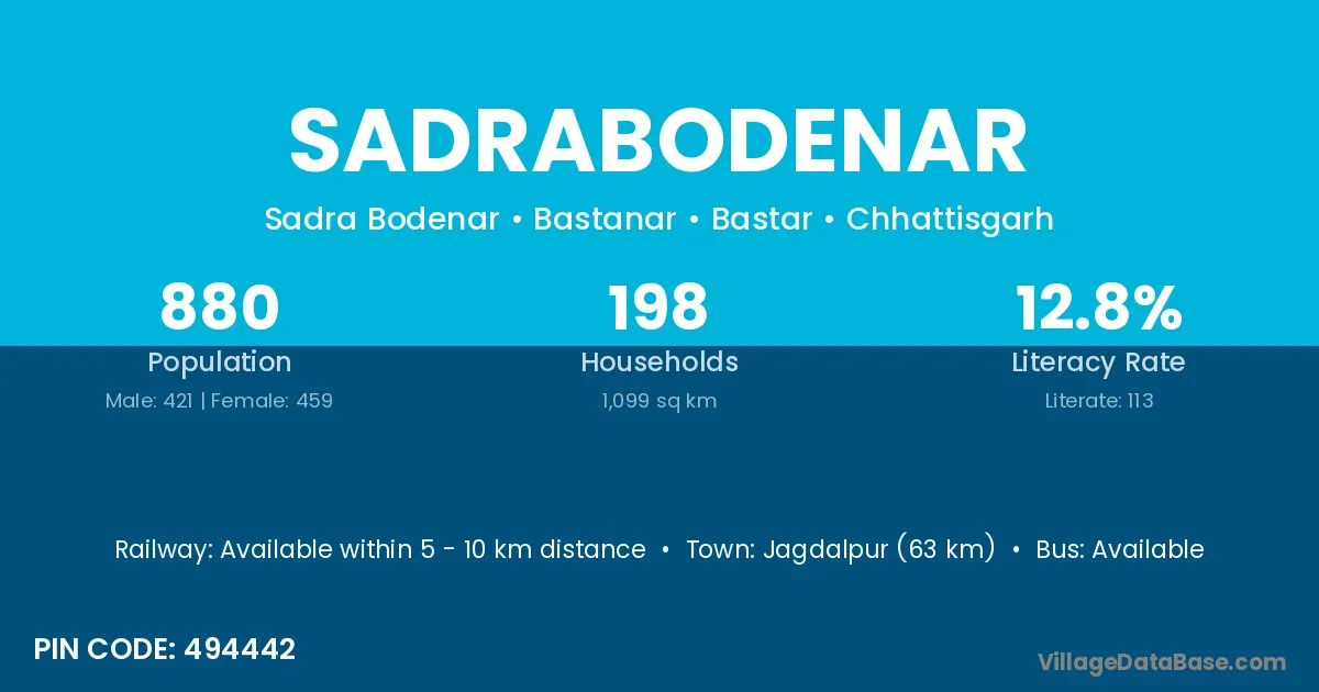 Jagdalpur (63 km) is the nearest town to Sadrabodenar village for major economic activities and is located approximately 63 km away.