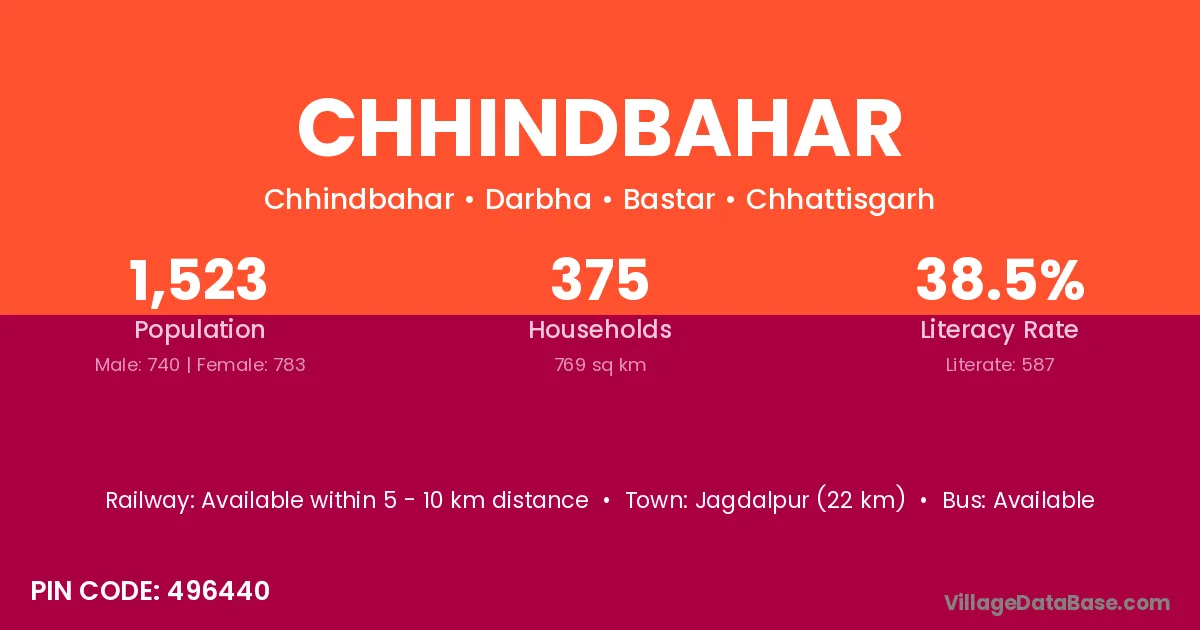 Jagdalpur (22 km) is the nearest town to Chhindbahar village for major economic activities and is located approximately 22 km away.