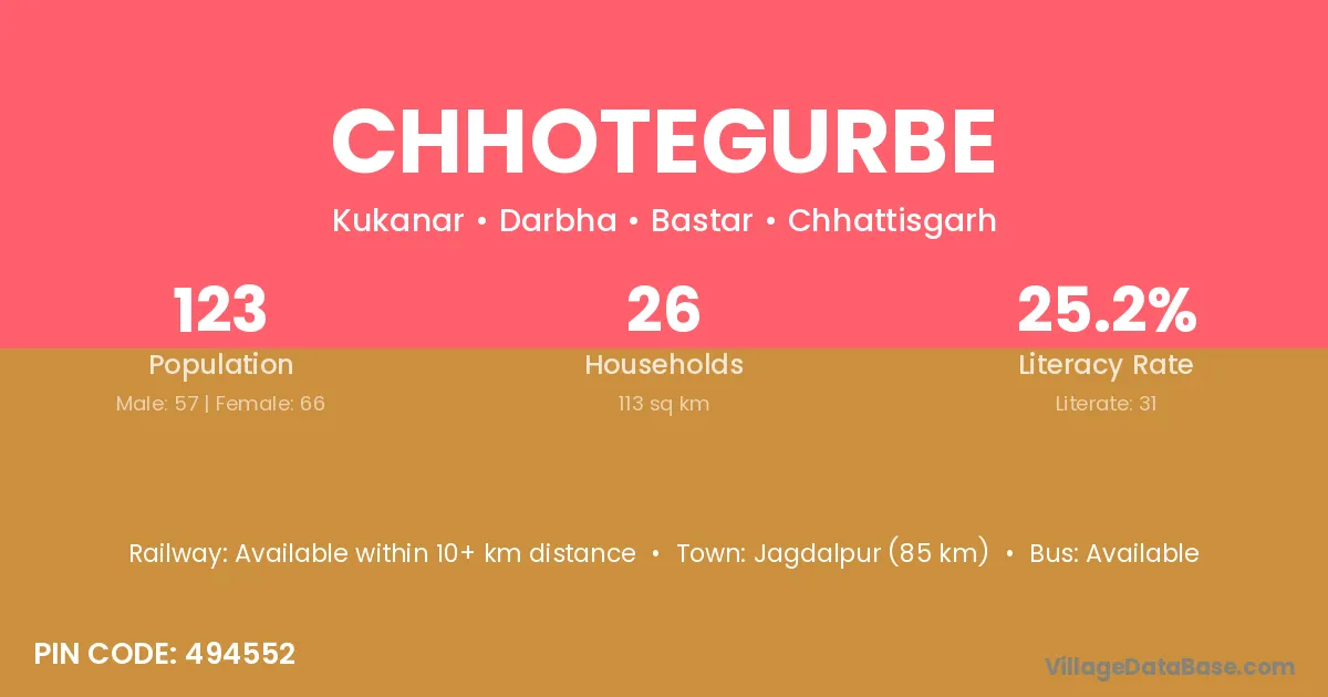 Chhotegurbe village has a total population of 123 people, of which 57 are males and 66 are females.
