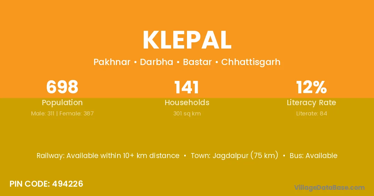 Jagdalpur (75 km) is the nearest town to Klepal village for major economic activities and is located approximately 75 km away.