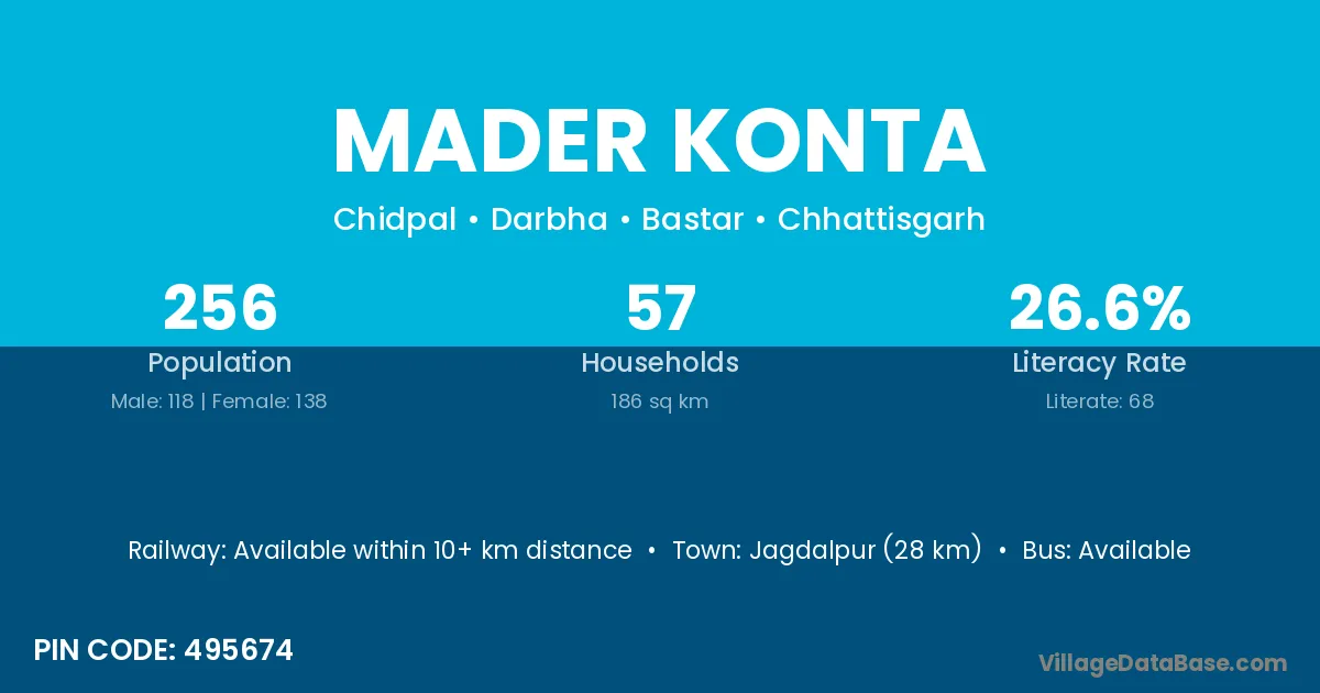 Jagdalpur (28 km) is the nearest town to Mader Konta village for major economic activities and is located approximately 28 km away.