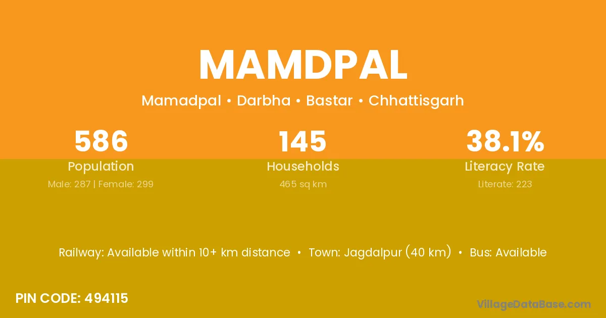 Jagdalpur (40 km) is the nearest town to Mamdpal village for major economic activities and is located approximately 40 km away.