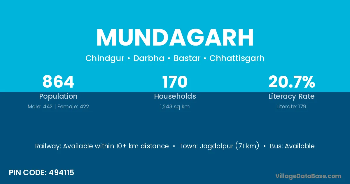 Jagdalpur (71 km) is the nearest town to Mundagarh village for major economic activities and is located approximately 71 km away.