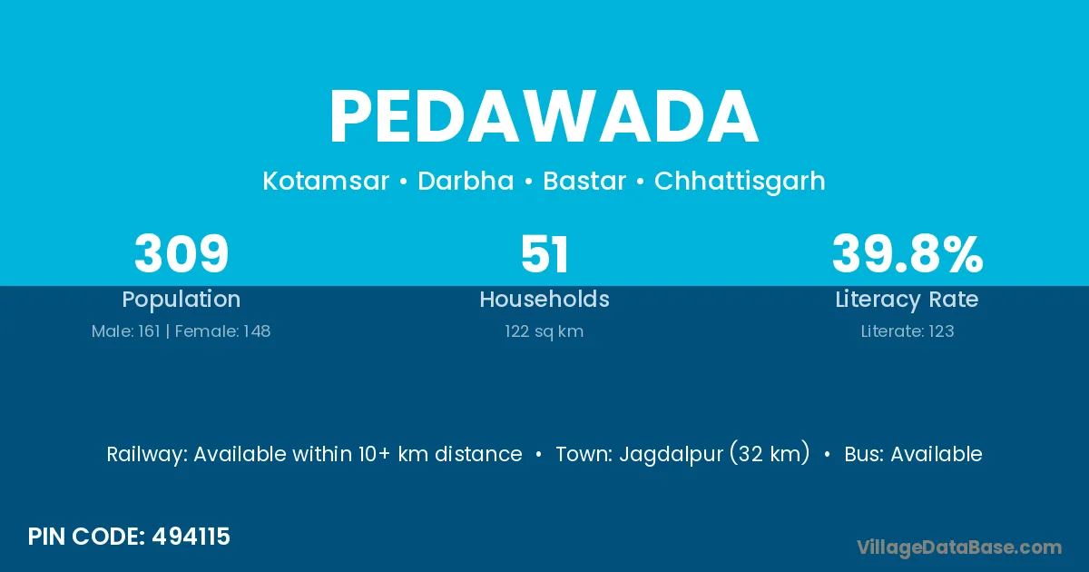 Jagdalpur (32 km) is the nearest town to Pedawada village for major economic activities and is located approximately 32 km away.