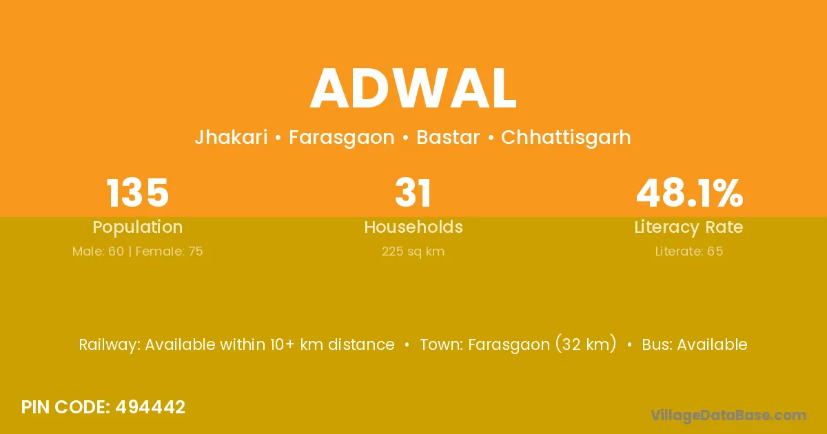 Farasgaon (32 km) is the nearest town to Adwal village for major economic activities and is located approximately 32 km away.
