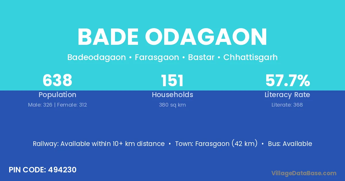 Farasgaon (42 km) is the nearest town to Bade Odagaon village for major economic activities and is located approximately 42 km away.