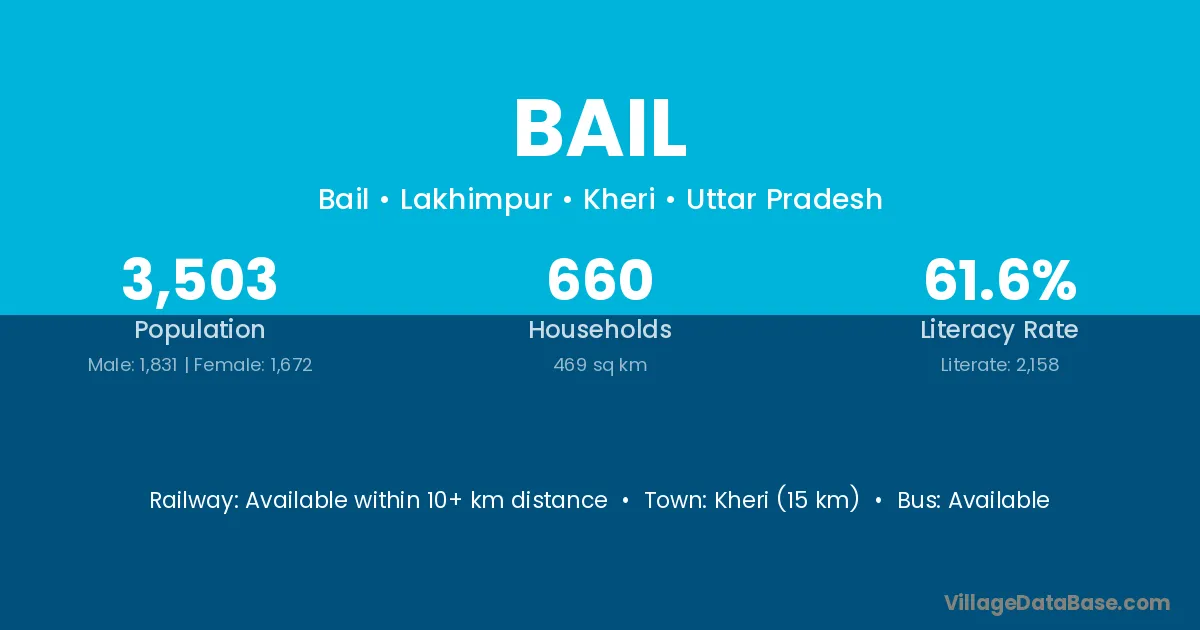 The literacy rate of Bail village is 47.66%. Male literacy stands at 60.75% and female literacy at 35.29%.