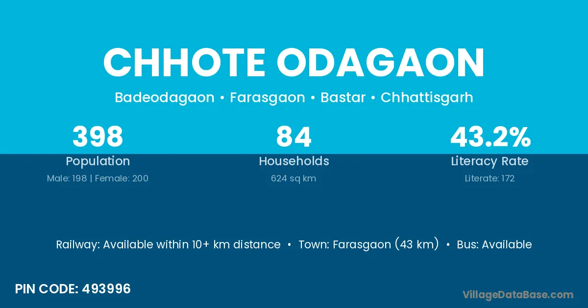 Farasgaon (43 km) is the nearest town to Chhote Odagaon village for major economic activities and is located approximately 43 km away.