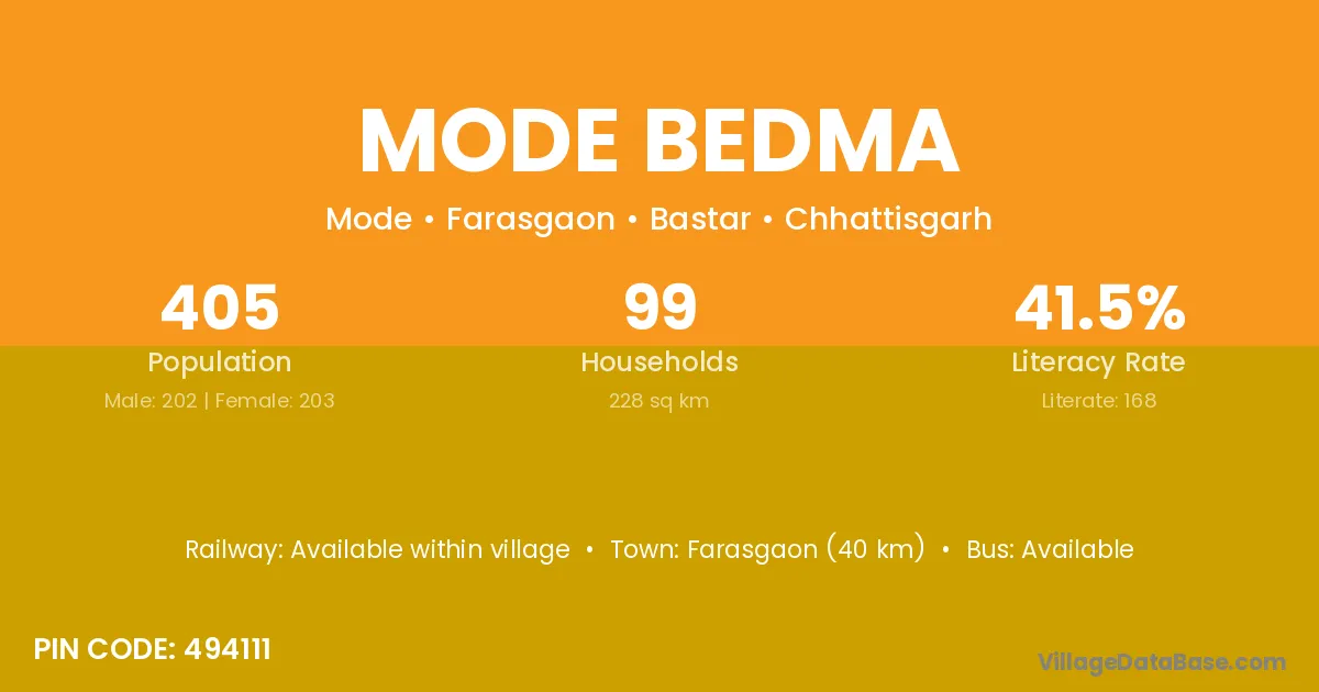 Farasgaon (40 km) is the nearest town to Mode Bedma village for major economic activities and is located approximately 40 km away.