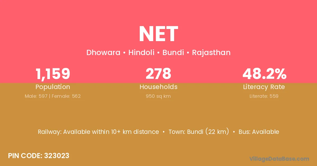 The literacy rate of Net village is 33.57%. Male literacy stands at 39.85% and female literacy at 27.89%.