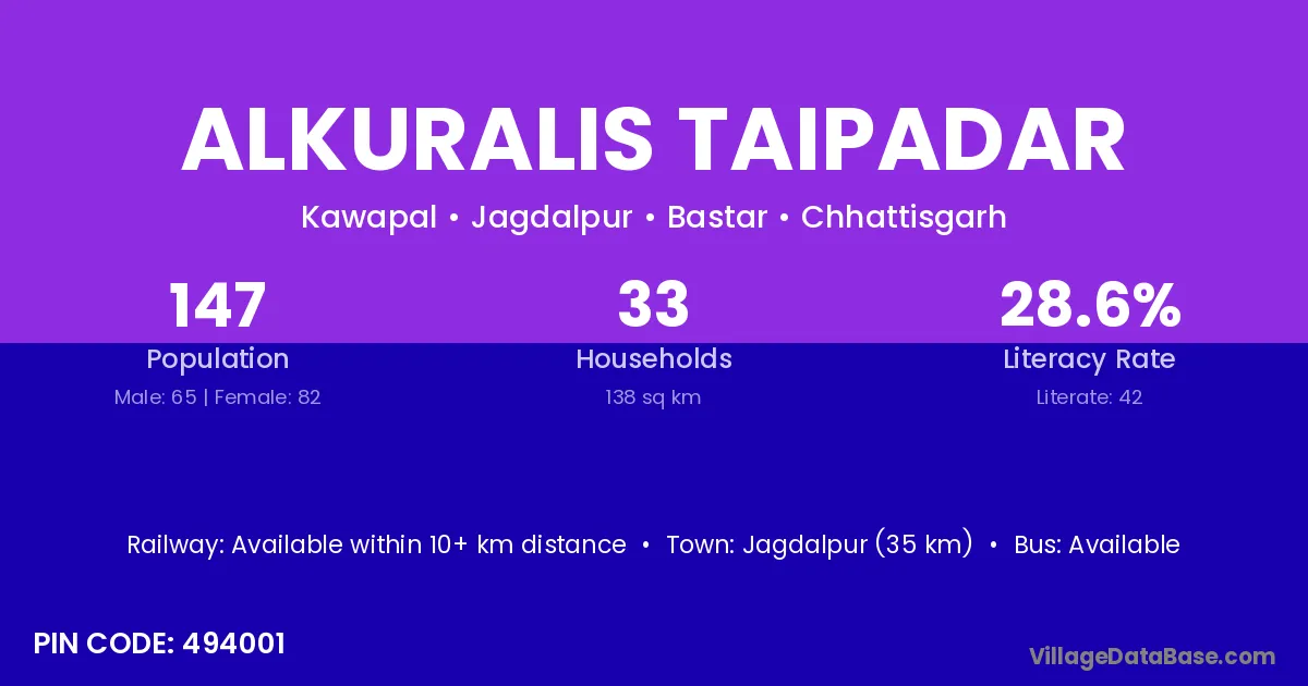 Jagdalpur (35 km) is the nearest town to Alkuralis Taipadar village for major economic activities and is located approximately 35 km away.