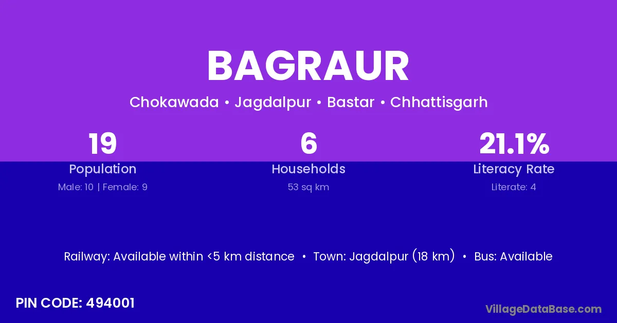 Jagdalpur (18 km) is the nearest town to Bagraur village for major economic activities and is located approximately 18 km away.