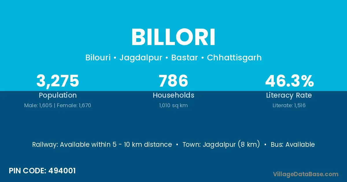 Jagdalpur (8 km) is the nearest town to Billori village for major economic activities and is located approximately 8 km away.