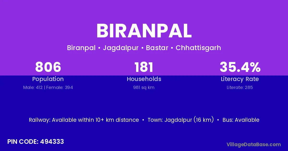 Jagdalpur (16 km) is the nearest town to Biranpal village for major economic activities and is located approximately 16 km away.