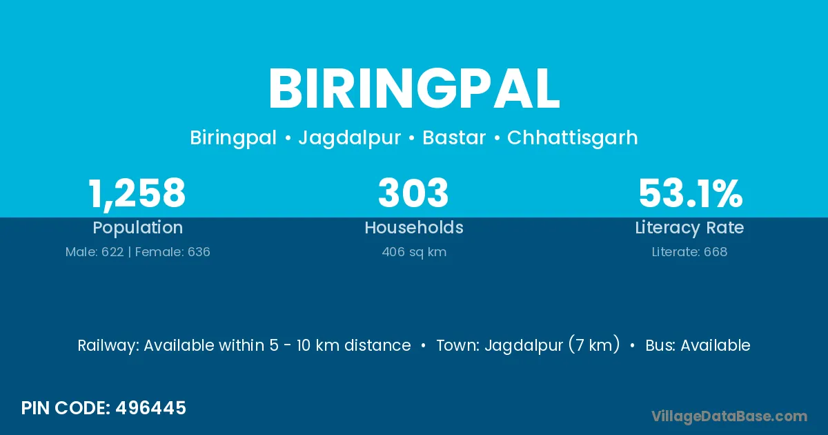 Jagdalpur (7 km) is the nearest town to Biringpal village for major economic activities and is located approximately 7 km away.