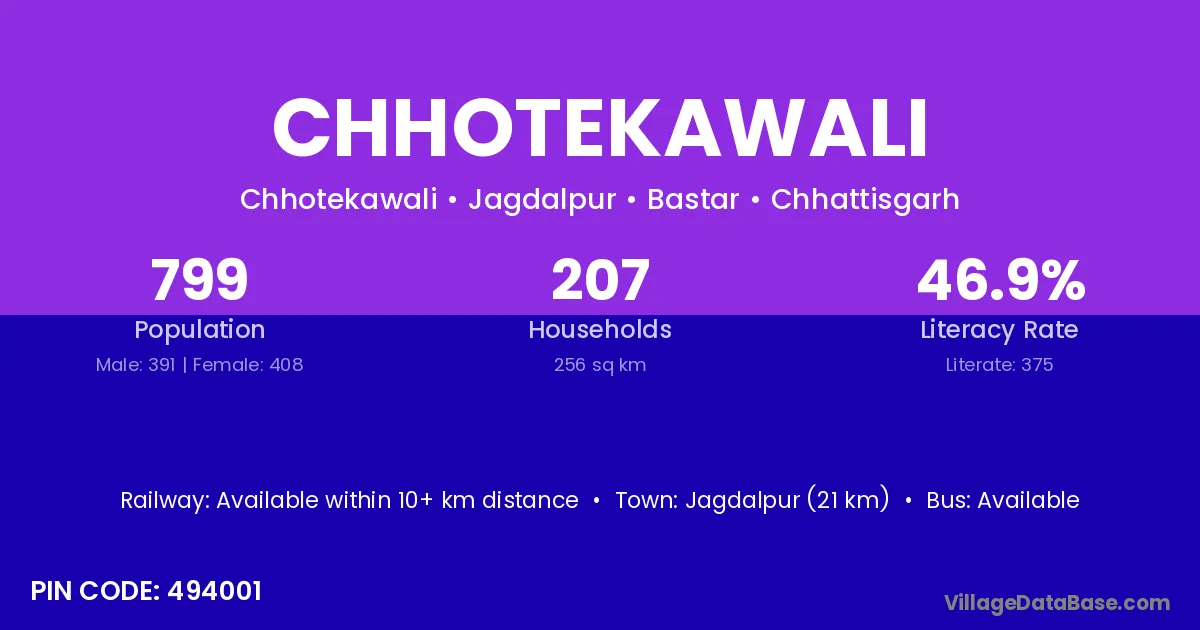 Jagdalpur (21 km) is the nearest town to Chhotekawali village for major economic activities and is located approximately 21 km away.