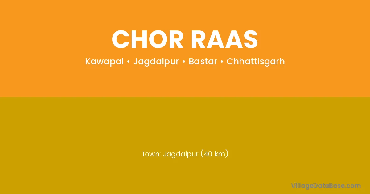 Jagdalpur (40 km) is the nearest town to Chor Raas village for major economic activities and is located approximately 40 km away.