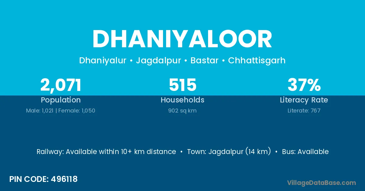 Jagdalpur (14 km) is the nearest town to Dhaniyaloor village for major economic activities and is located approximately 14 km away.