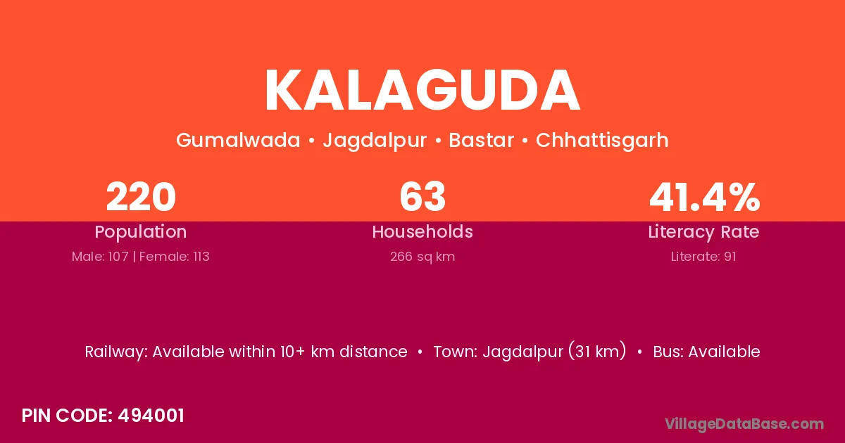 Jagdalpur (31 km) is the nearest town to Kalaguda village for major economic activities and is located approximately 31 km away.