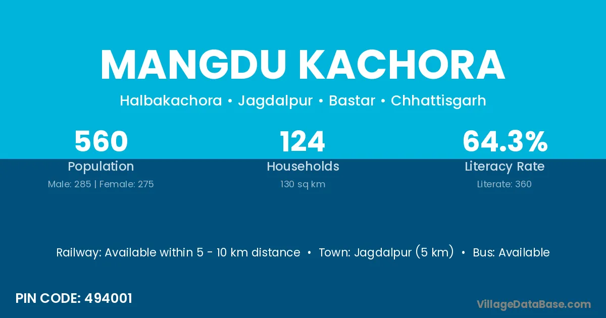 Jagdalpur (5 km) is the nearest town to Mangdu Kachora village for major economic activities and is located approximately 5 km away.