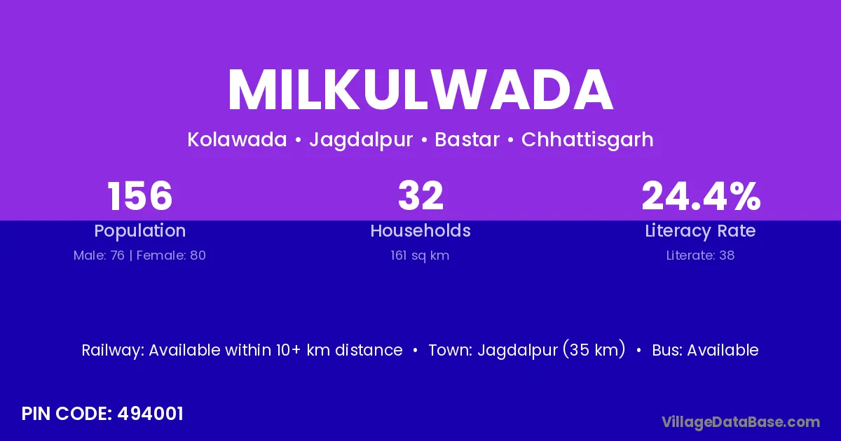 Jagdalpur (35 km) is the nearest town to Milkulwada village for major economic activities and is located approximately 35 km away.