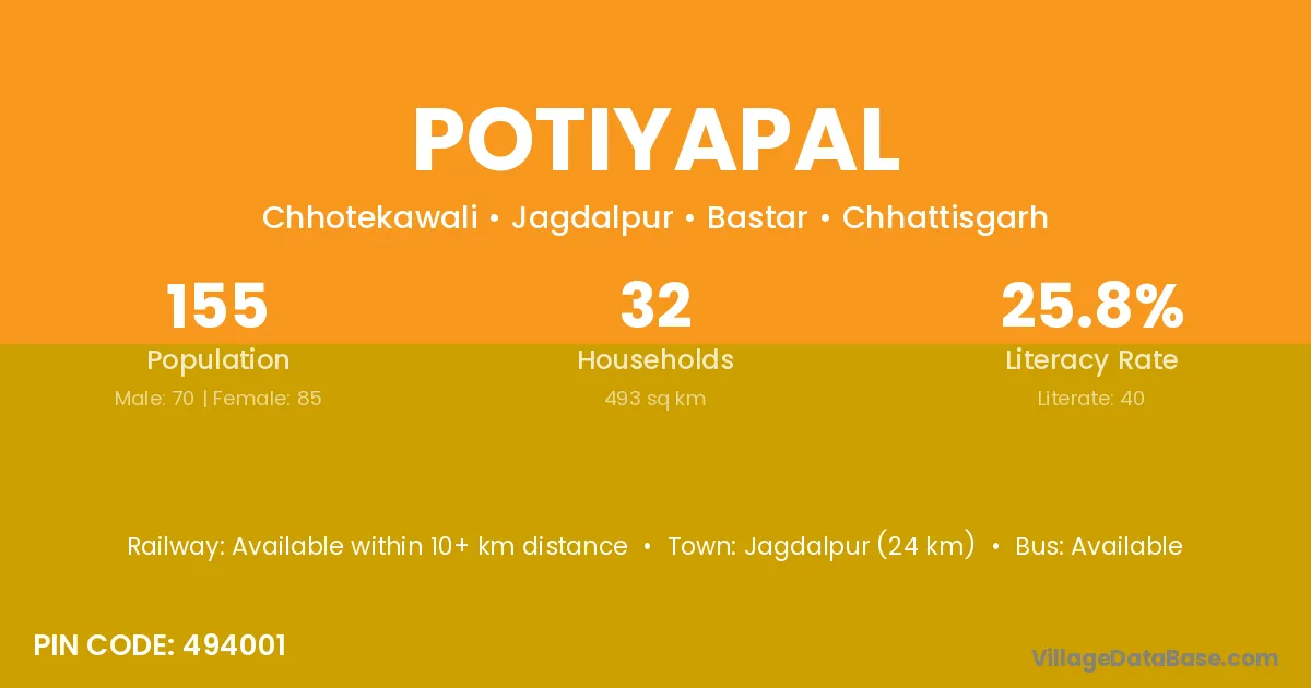 Jagdalpur (24 km) is the nearest town to Potiyapal village for major economic activities and is located approximately 24 km away.