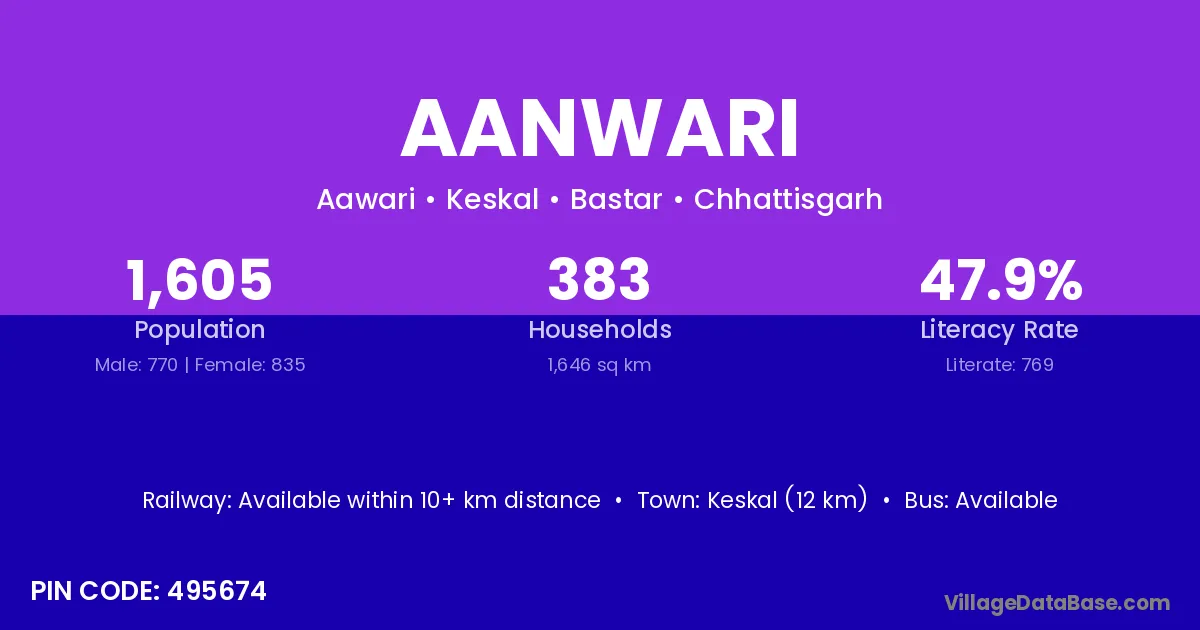 Keskal (12 km) is the nearest town to Aanwari village for major economic activities and is located approximately 12 km away.