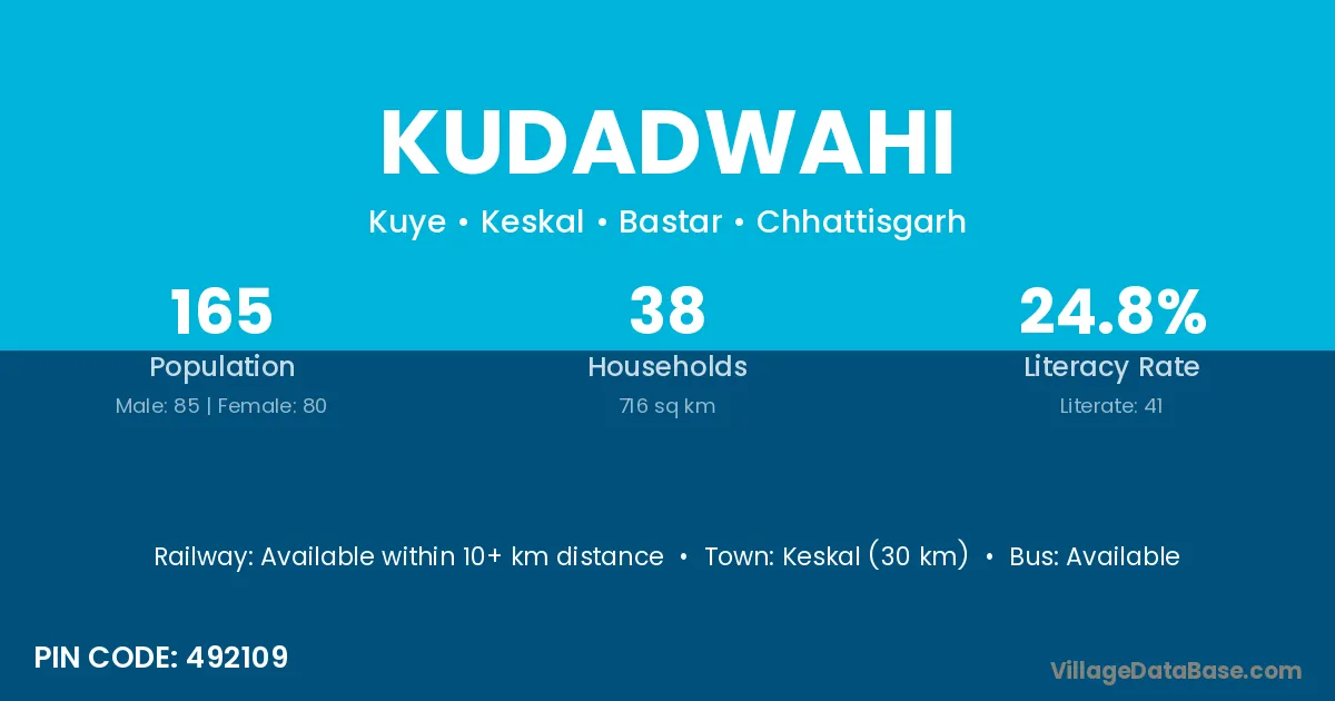 Keskal (30 km) is the nearest town to Kudadwahi village for major economic activities and is located approximately 30 km away.